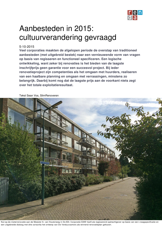 Veel corporaties maakten de afgelopen periode de overstap van traditioneel aanbesteden (met uitgebreid bestek) naar een vernieuwende vorm van vragen op basis van regisseren en functioneel specificeren. Een logische ontwikkeling, want zeker bij renovaties is het bieden van de laagste inschrijfprijs geen garantie voor een succesvol project. Bij ieder renovatieproject zijn competenties als het omgaan met huurders, realiseren van een haalbare planning en omgaan met verrassingen, minstens zo belangrijk. Daarbij komt nog dat de laagste prijs aan de voorkant niets zegt over het totale exploitatieresultaat. Aansluitend bij dit artikel is de kennispaper 'Het nieuwe opdrachtgeven' opgesteld. Deze is geschreven door Marcel van Bodegraven (Aardvast), Stefan Katier (Kabu) en Sean Vos (SlimRenoveren). De paper is gratis aan te vragen bij Renda.
