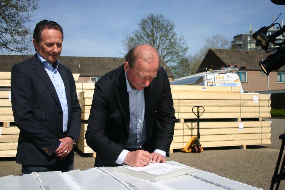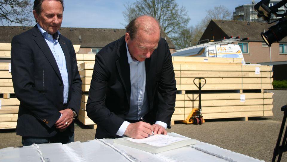 Ondertekening van het Convenant Betonrecycling door voorzitter Ton van der Giessen van BRBS en voorzitter Will Verwer van de Stichting Dakmeester