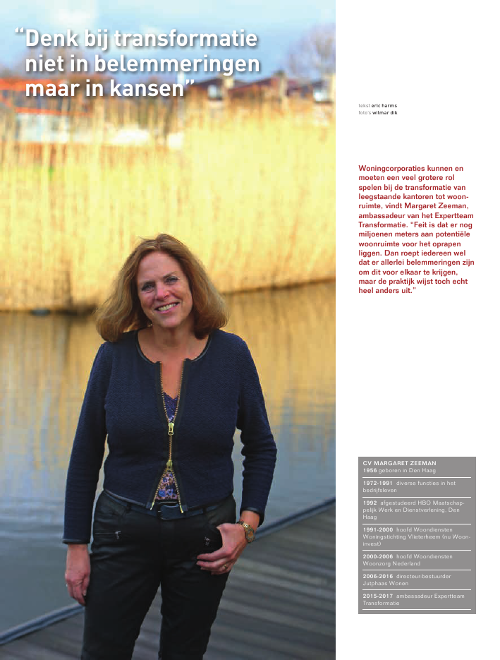 Woningcorporaties kunnen en moeten een veel grotere rol spelen bij de transformatie van leegstaande kantoren tot woonruimte, vindt Margaret Zeeman, ambassadeur van het Expertteam Transformatie. "Feit is dat er nog miljoenen meters aan potentiële woonruimte voor het oprapen liggen. Dan roept iedereen wel dat er allerlei belemmeringen zijn om dit voor elkaar te krijgen, maar de praktijk wijst toch echt heel anders uit.