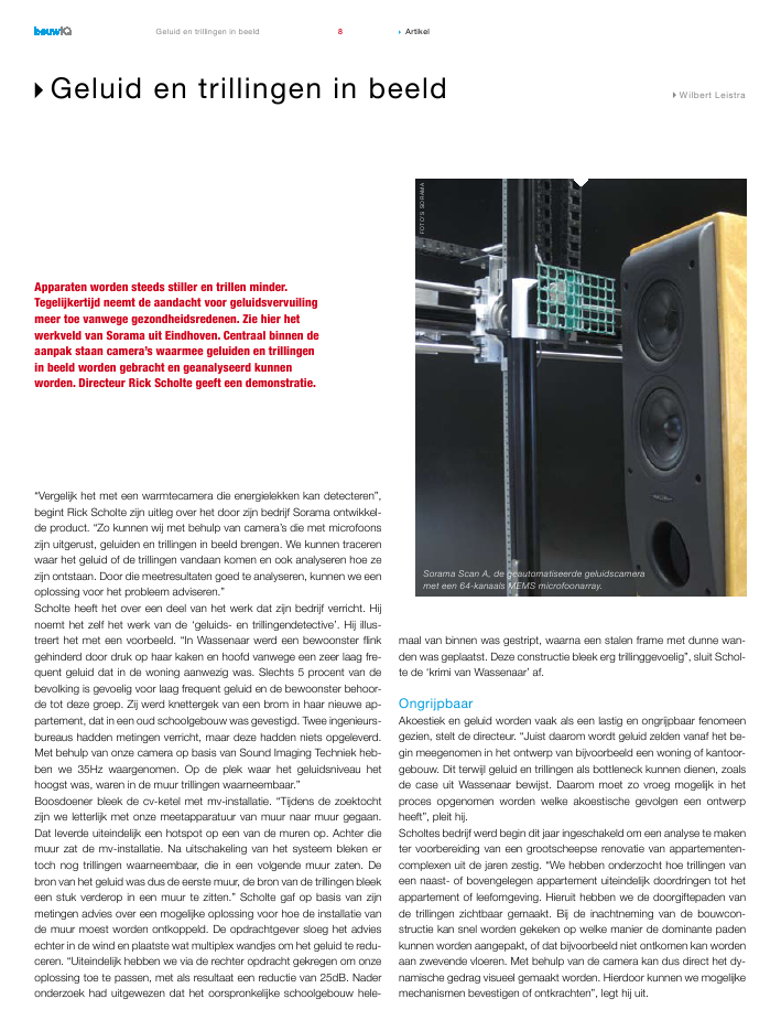 Apparaten worden steeds stiller en trillen minder. Tegelijkertijd neemt de aandacht voor geluidsvervuiling meer toe vanwege gezondheidsredenen. Zie hier het werkveld van Sorama uit Eindhoven. Centraal binnen de aanpak staan camera’s waarmee geluiden en trillingen in beeld worden gebracht en geanalyseerd kunnen worden. Directeur Rick Scholte geeft een demonstratie. Bekijk een video-uitzending waarin de werking van de geluidscamera’s wordt uitgelegd.