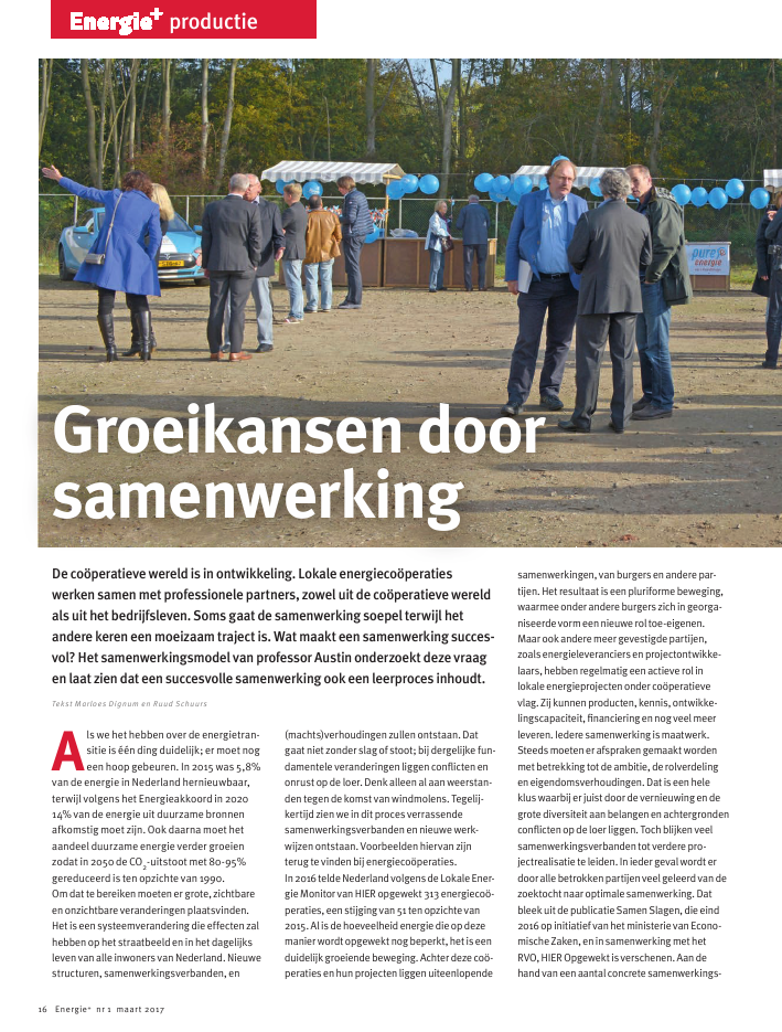 De coöperatieve wereld is in ontwikkeling. Lokale energiecoöperaties werken samen met professionele partners, zowel uit de coöperatieve wereld als uit het bedrijfsleven. Soms gaat de samenwerking soepel terwijl het andere keren een moeizaam traject is. Wat maakt een samenwerking succesvol? Het samenwerkingsmodel van professor Austin onderzoekt deze vraag en laat zien dat een succesvolle samenwerking ook een leerproces inhoudt.