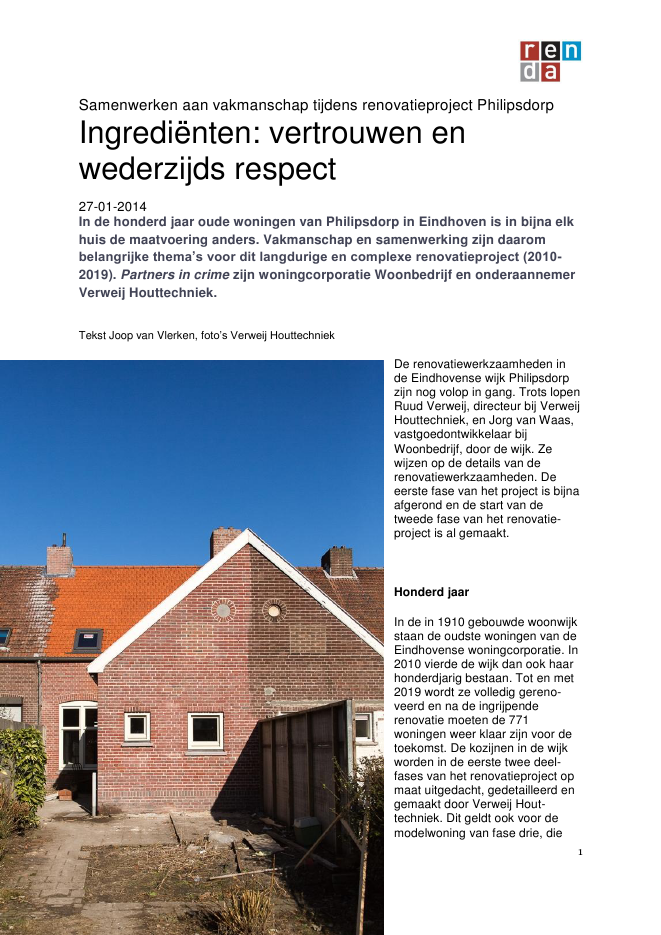 In de honderd jaar oude woningen van Philipsdorp in Eindhoven is in bijna elk huis de maatvoering anders. Vakmanschap en samenwerking zijn daarom belangrijke thema’s voor dit langdurige en complexe renovatieproject (2010-2019). Partners in crime zijn woningcorporatie Woonbedrijf en onderaannemer Verweij Houttechniek.