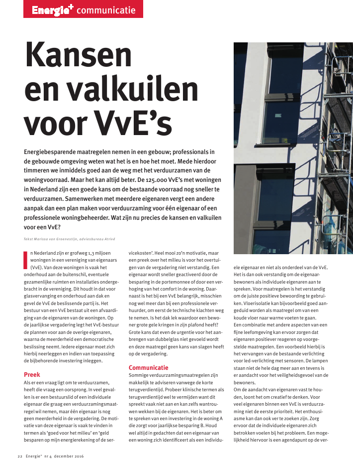 Tekst Marissa van Groenestijn, adviesbureau Atriv?Energiebesparende maatregelen nemen in een gebouw; professionals inde gebouwde omgeving weten wat het is en hoe het moet. Mede hierdoortimmeren we inmiddels goed aan de weg met het verduurzamen van dewoningvoorraad. Maar het kan altijd beter. De 125.000 VvE's met woningenin Nederland zijn een goede kans om de bestaande voorraad nog sneller teverduurzamen. Samenwerken met meerdere eigenaren vergt een andereaanpak dan een plan maken voor verduurzaming voor ??n eigenaar of eenprofessionele woningbeheerder. Wat zijn nu precies de kansen en valkuilenvoor een VvE?Kansenen valkuilenvoor VvE'sIn Nederland zijn er grofweg 1,3 miljoenwoningen in een vereniging van eigenaars(VvE). Van deze woningen is vaak hetonderhoud aan de buitenschil, eventuelegezamenlijke ruimten en installaties onderge-bracht in de vereniging. Dit houdt in dat voorglasvervanging en onderhoud aan dak engevel de VvE de beslissende partij is. Hetbestuur van een VvE bestaat uit een afvaardi-ging van de eigenaren van de woningen. Opde jaarlijkse vergadering legt het VvE-bestuurde plannen voor aan de overige eigenaren,waarna de meerderheid een democratischebeslissing neemt. Iedere eigenaar moet zichhierbij neerleggen en indien van toepassingde bijbehorende investering inleggen.PreekAls er een vraag ligt om te verduurzamen,heeft die vraag een oorsprong. In veel geval-len is er een bestuurslid of een individueleeigenaar die graag een verduurzamingsmaat-regel wil nemen, maar ??n eigenaar is noggeen meerderheid in de vergadering. De moti-vatie van deze eigenaar is vaak te vinden intermen als `goed voor het milieu' en `geldbesparen op mijn energierekening of de ser-vicekosten'. Heel mooi zo'n motivatie, maareen preek over het milieu is voor het overtui-gen van de vergadering niet verstandig. Eeneigenaar wordt sneller geactiveerd door debesparing in de portemonnee of door een ver-hoging van het comfort in de woning. Daar-naast is het bij een VvE belangrijk, misschiennog wel meer dan bij een professionele ver-huurder, om eerst de technische klachten wegte nemen. Is het dak lek waardoor een bewo-ner grote gele kringen in zijn plafond heeft?Grote kans dat even de urgentie voor het aan-brengen van dubbelglas niet gevoeld wordten deze maatregel geen kans van slagen heeftop de vergadering.CommunicatieSommige verduurzamingsmaatregelen zijnmakkelijk te adviseren vanwege de korteterugverdientijd. Probeer klinische termen alsterugverdientijd wel te vermijden want ditspreekt vaak niet aan en kan zelfs wantrou-wen wekken bij de eigenaren. Het is beter omte spreken van een investering in de woning Adie zorgt voor jaarlijkse besparing B. Houdwel altijd in gedachten dat een eigenaar vaneen woning zich identificeert als een individu-ele eigenaar en niet als onderdeel van de VvE.Het is dan ook verstandig om de eigenaar-bewoners als individuele eigenaren aan tespreken. Voor maatregelen is het verstandigom de juiste positieve bewoording te gebrui-ken. Vloerisolatie kan bijvoorbeeld goed aan-geduid worden als maatregel om van eenkoude vloer naar warme voeten te gaan.Een combinatie met andere aspecten van eenfijne leefomgeving kan ervoor zorgen dateigenaren positiever reageren op voorge-stelde maatregelen. Een voorbeeld hierbij ishet vervangen van de bestaande verlichtingvoor led-verlichting met sensoren. De lampenstaan niet de hele dag meer aan en tevens iser aandacht voor het veiligheidsgevoel van debewoners.Om de aandacht van eigenaren vast te hou-den, loont het om creatief te denken. Voorveel eigenaren binnen een VvE is verduurza-ming niet de eerste prioriteit. Het enthousi-asme kan dan ook ver te zoeken zijn. Zorgervoor dat de individuele eigenaren zichbetrokken voelen bij het probleem. Een moge-lijkheid hiervoor is een agendapunt op de ver-communicatie22 Energie+ nr 4 december 2016gadering waarbij kort de motivatie wordtgeschetst om te verduurzamen gevolgd dooreen luistersessie. De eigenaren kunnen hunindividuele klachten kwijt en kunnen helpende focus scherp te krijgen. Als een bewonerbijvoorbeeld aangeeft heel erg veel last tehebben van tocht door de kieren in de kopge-vel, terwijl de gevels niet in het maatregelen-pakket van het VvE-bestuur zitten, kan hetslim zijn het oplossen van deze problemenonderdeel te maken van de verduurzaming.Dat kan een positieve invloed hebben op dehouding van de bewoner tegenover de andereverduurzamingsmaatregelen. Deze wissel-werking tussen bestuur en eigenaren zorgtvoor een grotere betrokkenheid bij de ver-duurzaming van het complex.DoorzettenWanneer de eigenaren zich gehoord voelen naeen eerste sessie, is er direct een kans ditdoor te zetten in het verdere traject. Advi-seurs richten zich vaak alleen op de opdracht-gever en juist dit werkt niet bij VvE's. Door delage vergaderfrequentie met alle eigenaren,??n tot twee keer per jaar, kan het positievegevoel van gehoord worden, snel wegebben.Het is dan ook zaak intensief te informerendoor bijvoorbeeld een nieuwsbrief voor allebewoners over het onderzoek met daarin ookleuke tips en tricks om zelf eenvoudig energiete besparen. Ook het geven van een tussen-tijdse borrel met een soort tussenverslag kanerg goed werken. Deze meer informeleremomenten worden door veel eigenaren zeergewaardeerd.Ten opzichte van een verhuurder is een eige-naar binnen een VvE gevoeliger voor risico's."Kan het dak niet gaan lekken?", is een vaakgehoorde vraag bij het plaatsen van zonnepa-nelen. Probeer bij de communicatie over ener-giebesparende maatregelen dus ook vanuit debewoner te denken en deze risico's op voor-hand te benoemen en angst weg te nemen.Andere maatregelen?Voor een VvE geldt dat er precies dezelfdemaatregelen uitgevoerd kunnen worden als bijeen particulier of een verhuurder. Omdat heteen collectief besluit is, is het van belang deprioriteiten van de VvE in beschouwing tenemen. VvE's hebben vaak een meerjarenon-derhoudsplanning (MJOP). Bij het nemen vanenergiebesparende maatregelen is het ver-standig deze MJOP als leidraad te houden.S