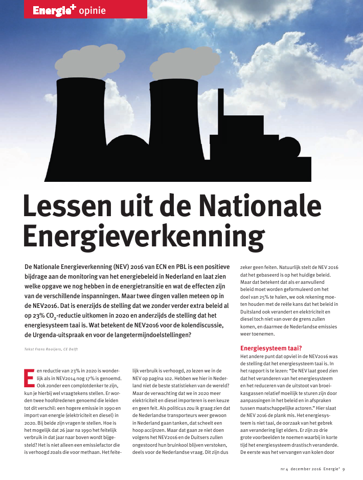 De Nationale Energieverkenning (NEV) 2016 van ECN en PBL is een positievebijdrage aan de monitoring van het energiebeleid in Nederland en laat zienwelke opgave we nog hebben in de energietransitie en wat de effecten zijnvan de verschillende inspanningen. Maar twee dingen vallen meteen op inde NEV2016. Dat is enerzijds de stelling dat we zonder verder extra beleid alop 23% CO2-reductie uitkomen in 2020 en anderzijds de stelling dat hetenergiesysteem taai is. Wat betekent de NEV2016 voor de kolendiscussie,de Urgenda-uitspraak en voor de langetermijndoelstellingen?Lessen uit de NationaleEnergieverkenningTekst Frans Rooijers, CE DelftEen reductie van 23% in 2020 is wonder-lijk als in NEV2014 nog 17% is genoemd.Ook zonder een complotdenker te zijn,kun je hierbij wel vraagtekens stellen. Er wor-den twee hoofdredenen genoemd die leidentot dit verschil: een hogere emissie in 1990 enimport van energie (elektriciteit en diesel) in2020. Bij beide zijn vragen te stellen. Hoe ishet mogelijk dat 26 jaar na 1990 het feitelijkverbruik in dat jaar naar boven wordt bijge-steld? Het is niet alleen een emissiefactor dieis verhoogd zoals die voor methaan. Het feite-lijk verbruik is verhoogd, zo lezen we in deNEV op pagina 102. Hebben we hier in Neder-land niet de beste statistieken van de wereld?Maar de verwachting dat we in 2020 meerelektriciteit en diesel importeren is een keuzeen geen feit. Als politicus zou ik graag zien datde Nederlandse transporteurs weer gewoonin Nederland gaan tanken, dat scheelt eenhoop accijnzen. Maar dat gaan ze niet doenvolgens het NEV2016 en de Duitsers zullenongestoord hun bruinkool blijven verstoken,deels voor de Nederlandse vraag. Dit zijn duszeker geen feiten. Natuurlijk stelt de NEV 2016dat het gebaseerd is op het huidige beleid.Maar dat betekent dat als er aanvullendbeleid moet worden geformuleerd om hetdoel van 25% te halen, we ook rekening moe-ten houden met de re?le kans dat het beleid inDuitsland ook verandert en elektriciteit endiesel toch niet van over de grens zullenkomen, en daarmee de Nederlandse emissiesweer toenemen.Energiesysteem taai?Het andere punt dat opviel in de NEV2016 wasde stelling dat het energiesysteem taai is. Inhet rapport is te lezen: "De NEV laat goed ziendat het veranderen van het energiesysteemen het reduceren van de uitstoot van broei-kasgassen relatief moeilijk te sturen zijn dooraanpassingen in het beleid en in afsprakentussen maatschappelijke actoren." Hier slaatde NEV 2016 de plank mis. Het energiesys-teem is niet taai, de oorzaak van het gebrekaan verandering ligt elders. Er zijn zo driegrote voorbeelden te noemen waarbij in kortetijd het energiesysteem drastisch veranderde.De eerste was het vervangen van kolen dooropinienr 4 december 2016 Energie+ 9aardgas voor het verwarmen van de Neder-landse woningen. In tien jaar tijd had bijnaiedereen aardgas door een systematischeaanpak van lage prijzen en vervangingssubsi-dies, maar ook mannetjes die langs de deurkwamen. Dit is een sterk voorbeeld dat laatzien dat als er een echt wil is om te veranderenhet dan ook snel kan gaan. Maar dan volstaathet niet om moeizame compromissen te zoe-ken, en kost het een paar centen.De tweede was de razendsnelle groei van hetWKK-vermogen in de glastuinbouw in de peri-ode 2006-2008. Binnen een paar jaar haddeze sector 2 GW aan effici?nt elektrisch ver-mogen ge?nstalleerd. Warmtekrachtinstalla-ties maken gebruik van de hoge elektriciteits-prijs om op die momenten te draaien enelektriciteit voor het openbare net te produce-ren en de warmte te bufferen. De derde veran-dering is de uitfasering van gascentrales tengunste van kolencentrales veroorzaakt doorde snelle groei van zon en wind waardoor demarginale prijs van elektriciteit fors lagerwerd. Ondanks dat velen verwachtten datgascentrales een mooie combinatie zoudenzijn met zon en wind, werden het de kolencen-trales die nu domineren en het aandeel gasfors hebben gereduceerd in de elektriciteits-productie. De elektriciteit uit zon en windwerd met forse subsidies in Duitsland op hetnet gezet, een daverend succes.Dus krachtig beleid en andere marktconditieszijn nodig. Dat zorgt ervoor dat de komendejaren het elektriciteitssysteem van bijna 100%fossiel in 2000 naar 45% hernieuwbaar in2023 gaat. Dat is niet wat ik taai noem. Hetenergiesysteem is dus niet taai, de reden dathet allemaal zo lang duurt is dat ons politiekesysteem in Nederland taai is en meestalslechts kleine stapjes kan zetten.Urgenda-doelstellingDe uitspraak van de rechter in de Urgenda-rechtzaak betekent dat Nederland 25% zelfmoet reduceren. Dus niet via het ETS, maarecht alle emissies in Nederland bij elkaarmoeten 25% lager zijn dan in 1990. Het isnatuurlijk een merkwaardige uitspraak diehelemaal voorbij gaat aan de kern van de kli-maatverandering, het maakt namelijk niet uitwaar de CO2 wordt ge?mitteerd. Daarom zouhet logischer zijn geweest als Urgenda gepleithad voor een verlaging van de CO2-emissiesten gevolge van het consumptiepatroon vanalle Nederlanders waar die ook plaatsvindt.Als we met z'n allen over de grens gaan tan-kolencentrales moet sluiten en besparingenbij de industrie specifiek moet treffen. Hetgereguleerde marktmechanisme is hier hetmeest geschikt voor, zonder tijdrovenderechtszaken over gedwongen sluiting,gewoon door CO2-emissie een prijs te geven.Voor de elektriciteitssector is een prijs vancirca 35 tot 50 per ton CO2 nodig om eenveel lagere CO2-emissie per kWh te krijgen.Maar het zal moeilijk zijn om dit op ditmoment in Europa te realiseren door moei-zame en taaie besluitvorming. Een alterna-tieve oplossing om specifiek op Nederlandsgrondgebied de emissies te verlagen, is datNederland aanvullend op het ETS eisen steltaan de elektriciteitsproductie, met name aande efficiency. In de vergunningen van de drienieuwe kolencentrales zijn al bepalingenopgenomen voor aanvullend beleid op hetgebied van broeikasgasemissies. Een eis aande maximale CO2-emissie per geproduceerdekWh van 400 g per kWh of aan het rendementvan elke elektriciteitscentra