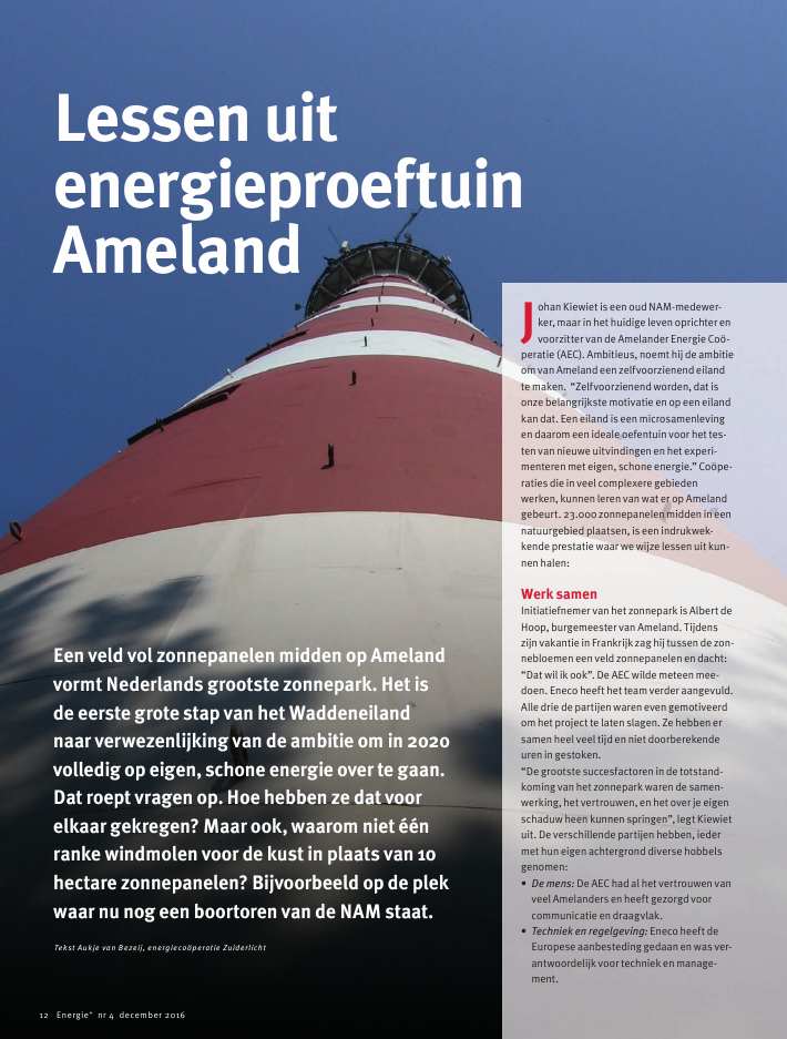 Tekst Aukje van Bezeij, energieco?peratie ZuiderlichtEen veld vol zonnepanelen midden op Amelandvormt Nederlands grootste zonnepark. Het isde eerste grote stap van het Waddeneilandnaar verwezenlijking van de ambitie om in 2020volledig op eigen, schone energie over te gaan.Dat roept vragen op. Hoe hebben ze dat voorelkaar gekregen? Maar ook, waarom niet ??nranke windmolen voor de kust in plaats van 10hectare zonnepanelen? Bijvoorbeeld op de plekwaar nu nog een boortoren van de NAM staat.Lessen uitenergieproeftuinAmelandJohan Kiewiet is een oud NAM-medewer-ker, maar in het huidige leven oprichter envoorzitter van de Amelander Energie Co?-peratie (AEC). Ambitieus, noemt hij de ambitieom van Ameland een zelfvoorzienend eilandte maken. "Zelfvoorzienend worden, dat isonze belangrijkste motivatie en op een eilandkan dat. Een eiland is een microsamenlevingen daarom een ideale oefentuin voor het tes-ten van nieuwe uitvindingen en het experi-menteren met eigen, schone energie." Co?pe-raties die in veel complexere gebiedenwerken, kunnen leren van wat er op Amelandgebeurt. 23.000 zonnepanelen midden in eennatuurgebied plaatsen, is een indrukwek-kende prestatie waar we wijze lessen uit kun-nen halen:Werk samenInitiatiefnemer van het zonnepark is Albert deHoop, burgemeester van Ameland. Tijdenszijn vakantie in Frankrijk zag hij tussen de zon-nebloemen een veld zonnepanelen en dacht:"Dat wil ik ook". De AEC wilde meteen mee-doen. Eneco heeft het team verder aangevuld.Alle drie de partijen waren even gemotiveerdom het project te laten slagen. Ze hebben ersamen heel veel tijd en niet doorberekendeuren in gestoken."De grootste succesfactoren in de totstand-koming van het zonnepark waren de samen-werking, het vertrouwen, en het over je eigenschaduw heen kunnen springen", legt Kiewietuit. De verschillende partijen hebben, iedermet hun eigen achtergrond diverse hobbelsgenomen:? De mens: De AEC had al het vertrouwen vanveel Amelanders en heeft gezorgd voorcommunicatie en draagvlak.? Techniek en regelgeving: Eneco heeft deEuropese aanbesteding gedaan en was ver-antwoordelijk voor techniek en manage-ment.12 Energie+ nr 4 december 2016? Financiering en vergunningen: Degemeente heeft zorg gedragen voor degrond, vergunningen en subsidies.Luister naar kritiekDe zonnepanelen zouden vogels en vliegtui-gen verblinden, het elektriciteitsnetwerk platleggen, meeuwenkoloni?n doen verdwijnen,de natuur onherstelbaar verstoren en deschoonheid van het dorpje Ballum aantasten.Het is een bloemlezing van tegenargumentendie op het internet te vinden zijn. Kiewiet gingsamen met de gemeente met de bewoners ingesprek. Hij lacht een paar argumenten weg,maar erkent dat er veel angst is geweest voorhet onbekende. "Tijdens de gesprekken heeftiedereen kunnen zeggen wat hij of zij er vanvond. En dat heeft gewerkt. Maar liefst eenderde van de Amelanders is lid geworden vande co?peratie en een deel heeft mee ge?nves-teerd. En de zonnepanelen liggen er, in hetverlengde van het vliegveld. Op arme grond,waar voorheen gras werd gemaaid voorkoeien", vertelt Kiewiet. Op het uitkijkpuntvoor de zonnepanelen vertelt hij dat zijn broerTheo Kiewiet namens de AEC samen met stu-denten onderzoek doet naar beplanting vande aarden wal rond en de grotere ruimtes tus-sen de panelen. "Wanneer die plannen door-gaan, wordt de biodiversiteit groter dan dieooit geweest is." Maar zover is het nog niet,de AEC is hierover nog in gesprek met degemeente.Benut kansenAls je alleen naar de productiecapaciteit kijktdan is het zonneveld eigenlijk een omgevallenoffshore windmolen in een weiland. Waaromgeen echte windmolen voor de kust? Er is tochgenoeg wind? Kiewiet antwoordt dat de eilan-ders bang zijn dat toeristen niet tegen eenwindmolen aan willen kijken. Dat ze hetnatuurgebied niet willen verstoren. Maar wieop een heldere dag aan de wadkant staat, zietniet eens zo ver weg nu toch al een hele batte-rij windmolens op het vasteland staan? En wierichting het natuurgebied de Oerd naar deNoordzee kijkt, ziet boortorens van de NAMaan de horizon. Is een windmolen van Ame-landers voor Amelanders dan niet beter? Alseen vuurtoren die waarschuwt voor risico'sdie deze kwetsbare eilanden lopen. Die dekoers wijst naar een duurzame toekomst diewe samen kunnen vormgeven. Maar eenander serieus obstakel vormen de gedepu-teerden van Provincie Friesland die nietinstemmen met windmolens op Ameland. Degedeputeerden hebben tijd nodig, de Amelan-ders en de toeristen misschien ook. En Ame-land heeft niet alleen veel wind, maar ookheel veel zon.Maak vriendenFreonen is Fries voor vrienden. En die heb jenodig om je grootschalige, duurzame ambi-ties te realiseren. Op Ameland heet de vrien-denclub `Duurzaam Ameland', die bestaatnaast de gemeente onder meer uit de NAM,GasTerra, Philips en Eneco. Voor een aantalprojecten werken ze samen met de AEC en hetEnergie Transitie Centrum (EnTranCe) van deHanzehogeschool in Groningen. Studenten,wetenschappers, marktpartijen, overheid,bewoners en toeristen (leden van de AEC)werken zo samen en zorgen voor de beno-digde kennis, middelen en draagvlak. Geziende ambitie om als eiland van het gas af tegaan, is de vriendschap met fossiele reuzenals de NAM en Gasterra opvallend. Zij hebbennamelijk in ruim 30 jaar tijd zo'n 40 miljardkuub Amelands gas gewonnen en verhandeld.Maar ook zij scharen zich achter de ambitieom Ameland in 2020 op eigen schone energieover te laten gaan. Met gasbaten van het gasaf dus? Of gaat dat nog te ver en geldt gas opAmeland ook als eigen en schone energie? Datzou je wel denken als je naar recente investe-ringen van Ameland kijkt: 45 over het eilandverspreide brandstofcellen die van gas elek-triciteit maken wanneer de opbrengst van hetzonnepark onvoldoende is, gasgestooktewarmtekrachtinstallaties voor de zwemba-den, een experiment met waterstof in aardgasvoor huishoudens en een aardgastankstationvoor de autobussen. 30 jaar gaswinning, gaatdat misschien in je systeem zitten? "Ja, degaswinning op Ameland speelt zeker een rol",zegt Kiewiet. Maar