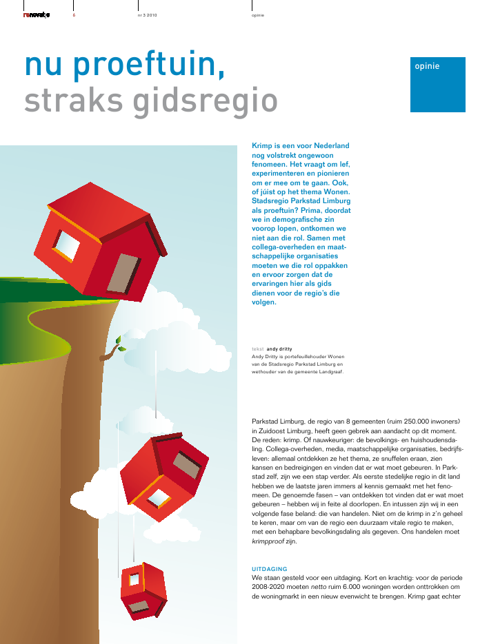Krimp is een voor Nederland nog volstrekt ongewoon fenomeen. Het vraagt om lef, experimenteren en pionieren om er mee om te gaan. Ook, of júist op het thema Wonen. Stadsregio Parkstad Limburg als proeftuin? Prima, doordat we in demografische zin voorop lopen, ontkomen we niet aan die rol. Samen met collega-overheden en maatschappelijke organisaties moeten we die rol oppakken en ervoor zorgen dat de ervaringen hier als gids dienen voor de regio’s die volgen.