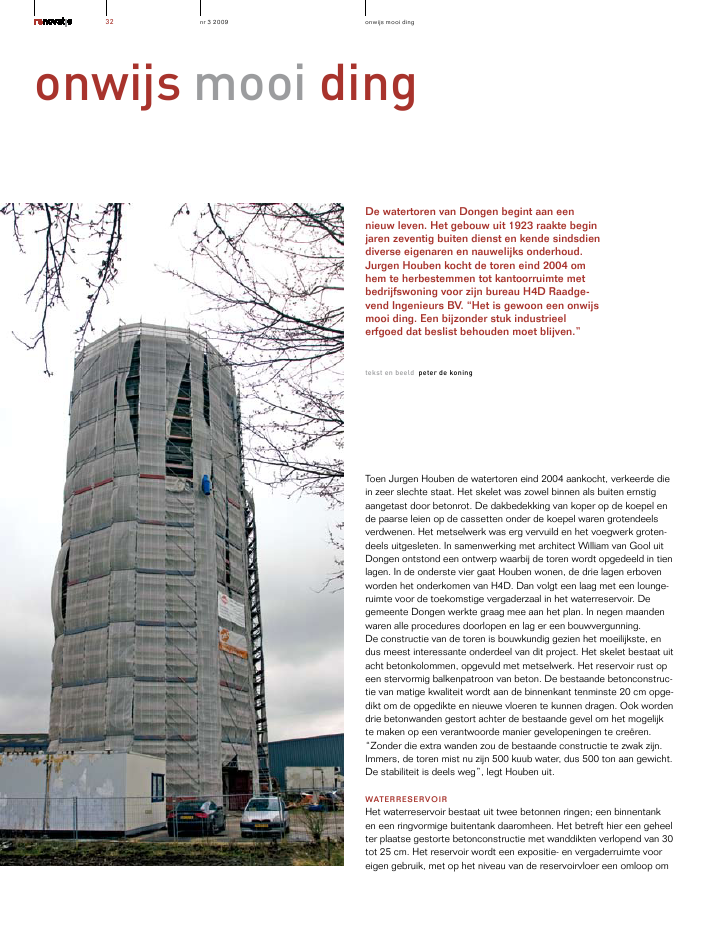 De watertoren van Dongen begint aan een nieuw leven. Het gebouw uit 1923 raakte begin jaren zeventig buiten dienst en kende sindsdiendiverse eigenaren en nauwelijks onderhoud. Jurgen Houben kocht de toren eind 2004 om hem te herbestemmen tot kantoorruimte met bedrijfswoning voor zijn bureau H4D Raadgevend Ingenieurs BV. “Het is gewoon een onwijs mooi ding. Een bijzonder stuk industrieel erfgoed dat beslist behouden moet blijven.”