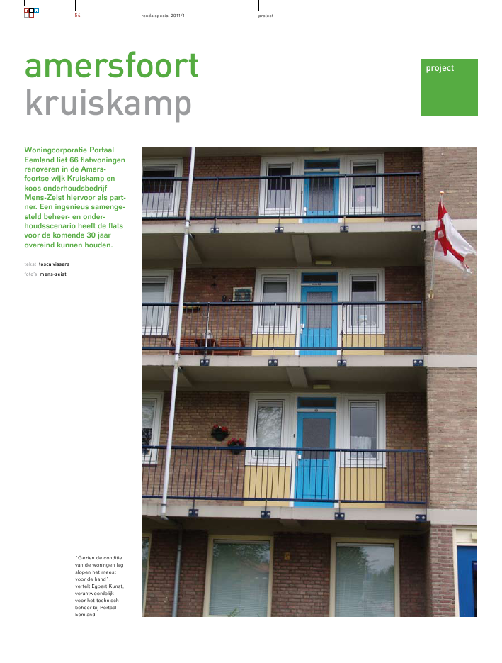 Woningcorporatie Portaal Eemland liet 66 flatwoningen renoveren in de Amersfoortse wijk Kruiskamp en koos onderhoudsbedrijf Mens-Zeist hiervoor als partner. Een ingenieus samengesteld beheer- en onderhoudsscenario heeft de flats voor de komende 30 jaar overeind kunnen houden.