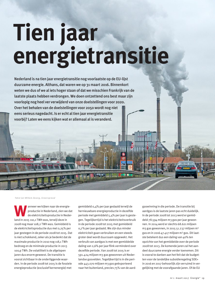 Nederland is na tien jaar energietransitie nog voorlaatste op de EU-lijst duurzame energie. Althans, dat waren we op 31 maart 2016. Binnenkort weten we dus of we al iets hoger staan of dat we misschien Frankrijk van de laatste plaats hebben verdrongen. We doen ontzettend ons best maar zijn voorlopig nog heel ver verwijderd van onze doelstellingen voor 2020. Over het behalen van de doelstellingen voor 2050 wordt nog niet eens serieus nagedacht. Is er echt al tien jaar energietransitie voorbij? Laten we eens kijken wat er allemaal al is veranderd.