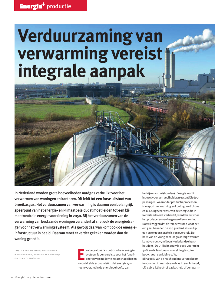 Een betaalbaar en betrouwbaar energie-systeem is een vereiste voor het functi-oneren van moderne maatschappijen enontwikkelde economie?n. Het energiesys-teem voorziet in de energiebehoefte vanbedrijven en huishoudens. Energie wordtingezet voor een veelheid aan essenti?le toe-passingen, waaronder productieprocessen,transport, verwarming en koeling, verlichtingen ICT. Ongeveer 20% van de energie die inNederland wordt verbruikt, wordt benut voorhet produceren van laagwaardige warmte.Dat wil zeggen dat de temperaturen waar hetom gaat beneden de 100 graden Celsius lig-gen en er geen sprake is van overdruk. Dehelft van de vraag naar laagwaardige warmtekomt van de 7,5 miljoen Nederlandse huis-houdens. De utiliteitsbouw is goed voor ruim40% en de landbouw, vooral de glastuin-bouw, voor een kleine 10%.Bijna 90% van de huishoudens verstookt omte voorzien in warmte aardgas in een hr-ketel,5% gebruikt hout- of gaskachels of een warm-Verduurzaming vanverwarming vereistintegrale aanpakIn Nederland worden grote hoeveelheden aardgas verbruikt voor hetverwarmen van woningen en kantoren. Dit leidt tot een forse uitstoot vanbroeikasgas. Het verduurzamen van verwarming is daarom een belangrijkspeerpunt van het energie- en klimaatbeleid, dat moet leiden tot een kli-maatneutrale energievoorziening in 2050. Bij het verduurzamen van deverwarming van bestaande woningen verandert al snel ook de energiedra-ger voor het verwarmingssysteem. Als gevolg daarvan komt ook de energie-infrastructuur in beeld. Daarom moet er verder gekeken worden dan dewoning groot is.Tekst Iris van Beuzekom, TU Eindhoven,Michiel van Dam, Enexis en Han Slootweg,Enexis en TU Eindhovenproductie14 Energie+ nr 4 december 2016tepomp en 5% is aangesloten op een warmte-net. Ook in de utiliteit wordt veel gebruikgemaakt van aardgas voor verwarming. Bijpanden met een grote behoefte aan warmte,zoals ziekenhuizen en zwembaden, wordtsoms Warmte Kracht Koppeling (WKK) toege-past. Het rendement daarvan is hoger isomdat warmte en elektriciteit tegelijkertijdworden geproduceerd; in verreweg de meestegevallen wordt echter ook in de utiliteitgebruik gemaakt van gasgestookte verwar-mingsketels.Trias energeticaHet verbranden van aardgas en andere fos-siele brandstoffen leidt tot uitputting vanschaarse hulpbronnen en heeft een negatieveinvloed op het klimaat. Nationaal en internati-onaal wordt daarom sterk ingezet op de ver-duurzaming van het energiesysteem. Dezeverduurzaming verloopt in een drietal stap-pen, die bekend staan als de Trias Energetica:1. Energie besparen: energie die niet wordtverbruikt, hoeft ook niet te worden gepro-duceerd.2.Energie duurzaam produceren: duurzameenergieproductie leidt niet uitputting vannatuurlijke hulpbronnen en ook niet tot uit-stoot van broeikasgas.3.Energie-effici?ntie bevorderen en uitstootbeperken: als het gebruik van fossielebrandstoffen onvermijdelijk is, dan dient ditzo effici?nt mogelijk te gebeuren en dientde uitstoot zoveel mogelijk te wordenbeperkt, bijvoorbeeld door gebruik temaken van CO2-afvang en -opslag.Gezien de grote hoeveelheden aardgas dieworden verbruikt voor het produceren vanlaagwaardige warmte voor verwarming vanwoningen en andere gebouwen is het ver-duurzamen van verwarming een belangrijkespeerpunt van het Nederlandse energie- enklimaatbeleid. Wanneer de drie genoemdestappen van de trias energetica worden toe-gepast op het verwarmen van woningen, danvalt op dat er de laatste jaren en decennia veelaandacht besteed is aan het bevorderen vande energie-effici?ntie, terwijl er ook de nodigeaandacht is voor energiebesparing, maar datduurzame energie bijna niet wordt ingezetvoor het verwarmen van woningen.Voor het besparen van energie die nodig isvoor verwarming door betere isolatie, is denodige aandacht. Bijna 90% van de woning-voorraad is geheel of gedeeltelijk voorzienvan dubbel glas; slechts iets meer dan dehelft is echter voorzien van muur- of vloeriso-latie, dus hier kunnen nog flinke stappen wor-den gemaakt. Als het gaat om verbetering vande energie-effici?ntie geldt dat in het jaar2000 nog minder dan 40% van de huizen eenhr-ketel had, maar dat dit inmiddels is opgelo-pen tot 90%. Hr-ketels zijn zo'n 20% effici?n-ter dan conventionele ketels, zodat ook hierflink wat energie wordt bespaard. Het gebruikvan duurzame energie voor verwarming, dederde stap van de Trias Energetica, is echterzeer beperkt. Meer dan 95% van de woningenwordt verwarmd met aardgas, en de fractieduurzaam geproduceerd groen gas in hettotale aardgasverbruik is nog verwaarloos-baar. In het licht van de beleidsdoelen en denoodzaak tot verduurzaming van het energie-systeem is de vraag hoe duurzamer kan wor-den voorzien in de warmtebehoefte vanwoningen daarom van groot belang.WarmtepompOm grotere slagen te kunnen maken op hetvlak van het verduurzamen van verwarmingvan woningen door alle stappen van de TriasEnergetica in te zetten, zijn ingrijpender maat-regelen nodig dan het vervangen van oudereketels door hr-ketels en isoleren. Er moet wor-den overgestapt op andere technologie enandere energiedragers. Een voor de hand lig-gende oplossing is de elektrische warmte-pomp, die in nieuwbouwhuizen al steedsmeer toegepast wordt. Elektriciteit is eenenergiedrager die relatief makkelijk duur-zaam geproduceerd kan worden uit zon ofwind. En het verplaatsen van warmte tegen denr 4 december 2016 Energie+ 15natuurlijke richting in, dus van een omgevingmet een lagere temperatuur naar een omge-ving met een hogere temperatuur, kost min-der energie dan het produceren van warmte.De benodigde warmte kan via diverse technie-ken uit de buitenlucht of bodem wordengehaald, eventueel met hergebruik van venti-latielucht. Een elektrische warmtepompdraagt dus bij aan energiebesparing en aanverduurzaming ? mits aangedreven metgroene stroom. Bij voorkeur in combinatiemet zonnepanelen lijkt de elektrische warm-tepomp daarom voor nieuwbouw de besteoplossing voor duurzaam verwarmen.Hoewel er onder de streep met een warmte-pomp energie bespaard wordt, neemt hetelektrici