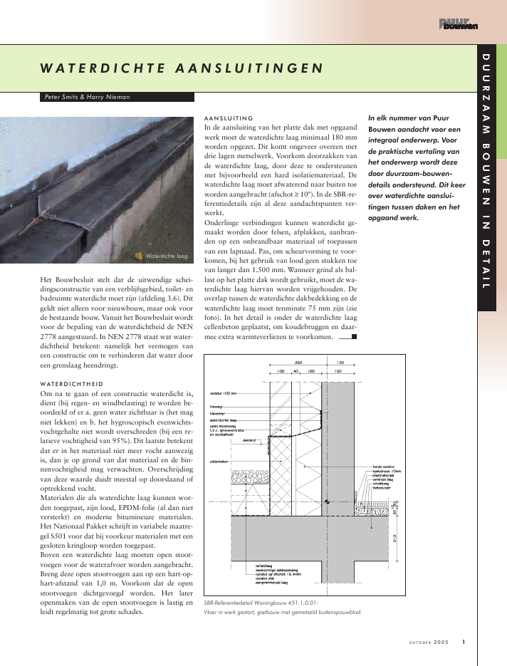 In elk nummer van Puur Bouwen aandacht voor een integraal onderwerp. Voor de praktische vertaling van het onderwerp wordt deze door duurzaam-bouwendetails ondersteund. Dit keer over waterdichte aansluitingen tussen daken en het opgaand werk.