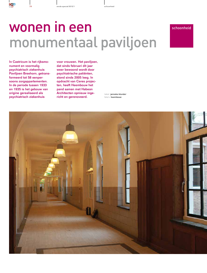 In Castricum is het rijksmonument en voormalig psychiatrisch ziekenhuis Paviljoen Breehorn, getransformeerd tot 58 eenpersoons zorgappartementen. In de periode tussen 1933 en 1935 is het gebouw van origine gerealiseerd als psychiatrisch ziekenhuis voor vrouwen. Het paviljoen, dat sinds februari dit jaar weer bewoond wordt door psychiatrische patiënten, stond sinds 2005 leeg. In opdracht van Ceres projecten, heeft Heembouw het pand samen met Habeon Architecten opnieuw ingericht en gerenoveerd.