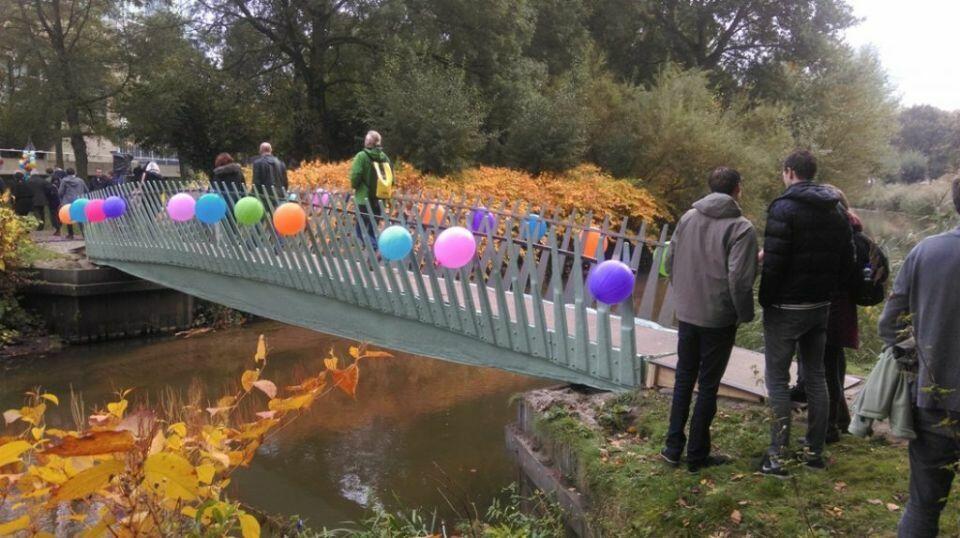 De brug werd in 35 werkdagen gerealiseerd. Toch verliep niet alles vlekkeloos. Sluis: “De brug werd eerst niet goedgekeurd. Hij moest namelijk stadionbelasting kunnen dragen, dit is 500 kg per m2. Voor een voetgangersbrug is dit eigenlijk niet nodig, maar toch werd deze voorwaarde gesteld. Daarnaast staat er in de normering dat leuningen van een brug altijd verankerd moeten zijn met staal. De brug was zonder stalen pinnen ook stevig genoeg, maar omdat het in de normering staat moesten we hieraan voldoen.”
