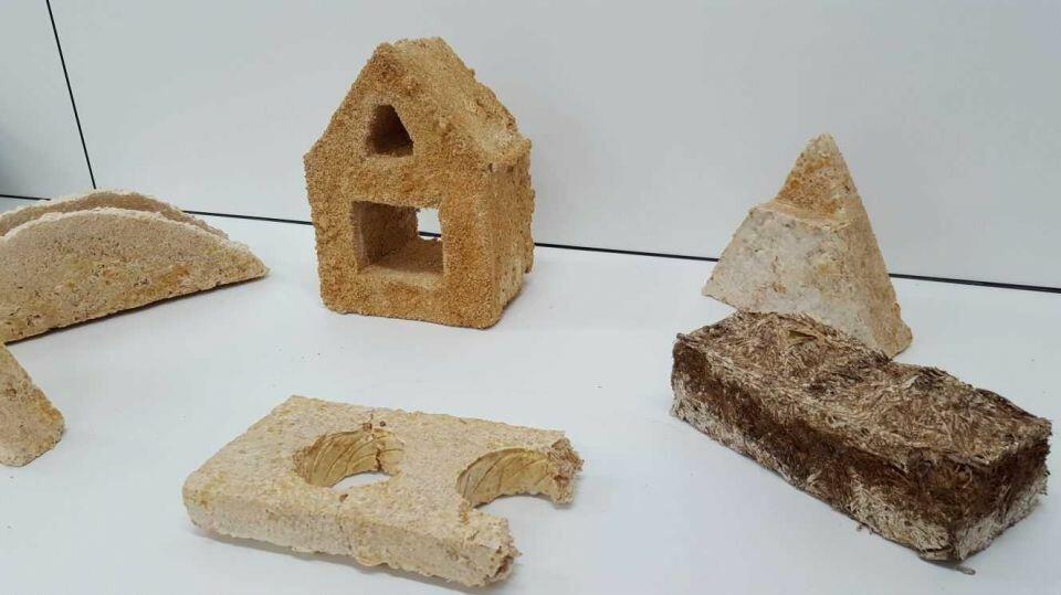 “Als je een mal met dit materiaal in de oven zet, gaan alle schimmels dood en wordt het blok hard en droog. Door middel van deze mallen is het mogelijk om producten te laten groeien die wellicht toepasbaar zijn in de bouwindustrie”, vertelt Sluis. “Het mes snijdt hier eigenlijk aan twee kanten. De Champignonboer kan bij ons zijn restafval kwijt, waar hij normaal gesproken voor moet betalen, en wij kunnen hier experimenteren met dit restafval door er myceliumcomposieten en andere producten van te maken.”
