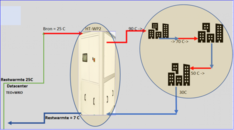 Er zijn echter ontwikkelingen met grote warmtepompen bekend waarbij mogelijkheden geboden worden om ook HT warmte te leveren. Door de omvang zijn ze niet geschikt voor toepassing in individuele woningen, maar wel als collectieve oplossing in wijken en buurten. Met zo’n opstelling is het tevens mogelijk om elektriciteit grootschalig – en dus voordelig – in te kopen. Dankzij dit schaalvoordeel is zowel de prijs van (groene) stroom als de opslag voor energiebelasting lager en zijn de netto stroomkosten vergelijkbaar of zelfs lager.