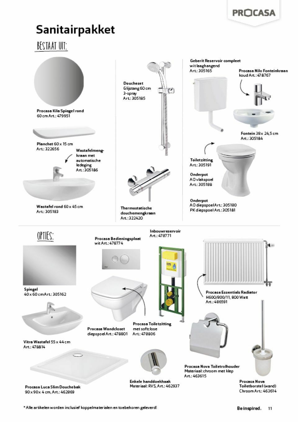 Compleet en op elkaar afgestemd, met suggesties voor keuken, badkamer, wand- en vloertegels en uitgebreid sanitairpakket. De Procasa pakketten zijn inclusief diverse opties voor vloeren, raambekleding, binnendeuren en beslag. Uitstekend geschikt voor zowel nieuwbouw- als renovatieprojecten, van woningen en appartementen tot vakantiebungalows en andere recreatieobjecten