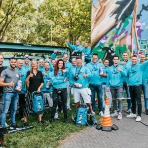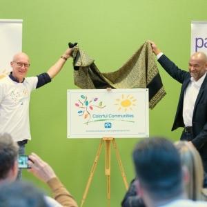 Het kunstwerk op de 23 meter hoge gevel van een flatgebouw aan de Vulcanusdreef werd aangeboden door Sigma Coatings, won...