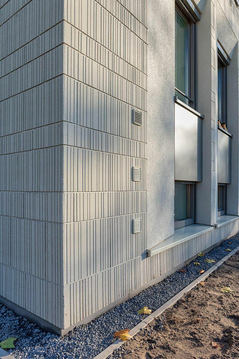 Een afwerking met baksteenstrips wilde Zuidam niet, maar toen tijdens een gesprek met Sto Isoned de Ecoshapes, prefab stucvormen op basis van minerale componenten, in beeld kwamen werd ze erg enthousiast. “Dan heb je een product dat je helemaal naar je eigen hand kunt zetten. We hebben zelf tegels ontworpen waarmee we toch nog de link naar wederopbouw hebben kunnen leggen, zowel met de kleur als het patroon.” In het originele gebouw zaten namelijk betonaccenten met een verticale belijning. Die belijning heeft FAAM in extrema gebruikt om de naden van de tegels zoveel mogelijk weg te werken en er een spel mee te spelen, speciale effecten mee te creëren. Ook de dikte van het isolatiemateriaal leverde ontwerpmogelijkheden op waar de architect dankbaar gebruik van maakte. “Geweldig voor ons als architect dat we die dingen konden doen, maar ik realiseer me dat we het er voor de verwerkers niet makkelijker op hebben gemaakt.”