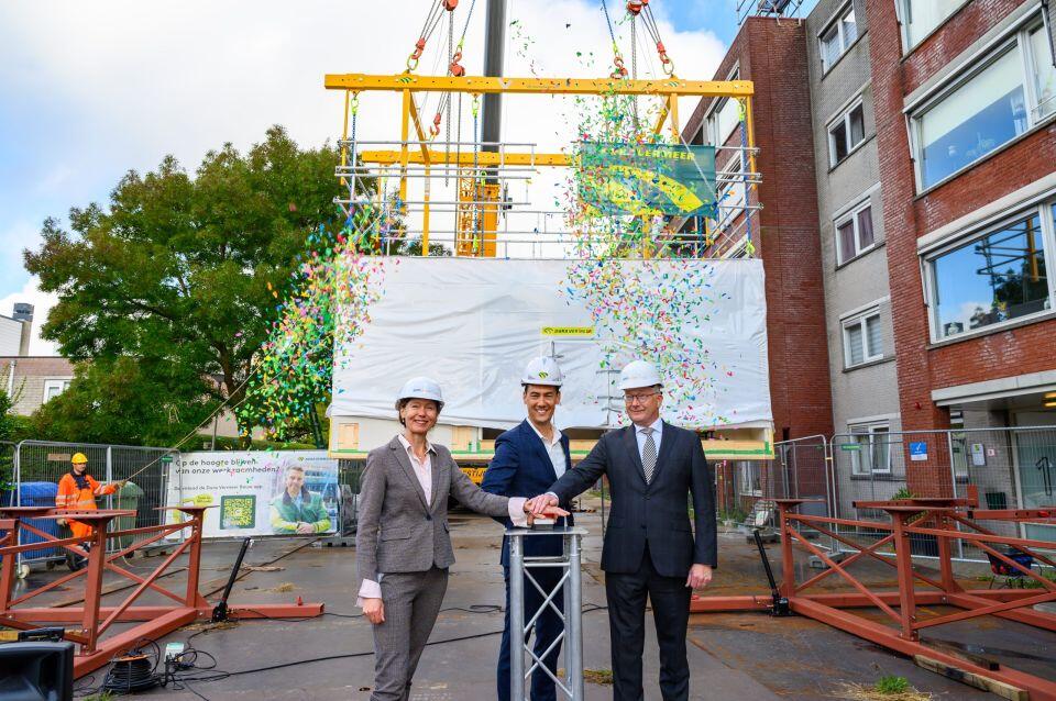 Manager Vastgoed Remco Bouter van SOR, en pleitbezorger van het optoppen geeft in zijn toespraak het belang aan van het toevoegen van woningen voor ouderen in Rotterdam. Hiermee komt mede de doorstroming op gang. “Als corporatie hebben we een maatschappelijke verantwoordelijkheid om voor betaalbare woningen te zorgen. SOR heeft hiervoor de BIG5 bedacht, en vandaag is een belangrijke mijlpaal. Vandaag worden de eerste van 44 op-top-woningen op het dak geplaatst.” Edwin Blom, directievoorzitter bij Dura Vermeer benadrukt de noodzaak van het toevoegen van woningen en wenst alle betrokken veel succes bij dit unieke project.