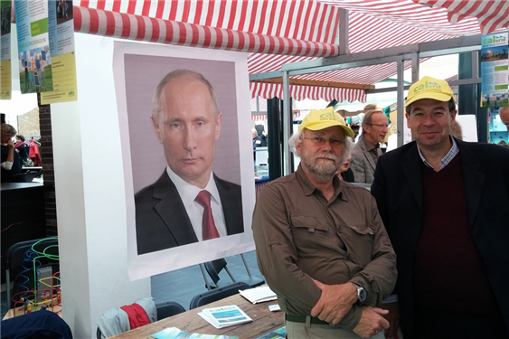 Vrijwel iedereen die tijdens de duurzaamheidsmarkt voorbij liep aan onze kraam wilde wel even een praatje maken over die meneer Poetin. Op één persoon na leidde het tot een lach en geanimeerde gesprekken. Die ene persoon dacht dat wij van Gazprom waren, maar gelukkig konden we hem snel uit de brand helpen. Ook met hem voerden wij het juiste gesprek over lokale duurzame energie en alles wat daarvoor pleit. Dat is meer dan alleen duurzaamheid en ook lokale economie, koopkracht, gemeenschap en democratie. Interessant is hoe je tegenwoordig de stabiliteit van internationale betrekkingen in dat rijtje kunt opnemen. Het niet betalen van je energierekening aan ‘petrodictators’ kan een argument zijn voor mensen om mee te doen aan een lokaal duurzaam energiebedrijf.