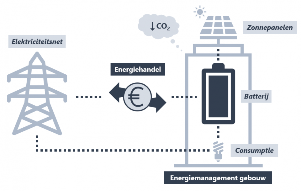 De relatie met de wijk is heel belangrijk. We zien dat thuiswerken en de energietransitie (denk aan: installatie van elektrische kookplaten) leiden tot een veel hogere vraag naar elektriciteit. In veel gebouwen wordt het piekverbruik 2 of soms zelf 3 keer hoger. Zo veel zelfs, dat netbeheerders de vraag op lokaal niveau niet aankunnen. Het aantal oplaadpunten voor elektrische auto’s wordt daarom vaak beperkt. Dat kan opgelost worden door een lokale opslag te creëren in het netwerk. Een batterij dus. Deze batterijopslag vangt de hogere piekbelasting op, en zorgt er bovendien voor dat de bestaande netwerkcapaciteit optimaal wordt gebruik. Woningcorporaties kunnen zo bijdragen aan de praktische vraagstukken waar netbeheerders en gemeenten voor komen te staan.