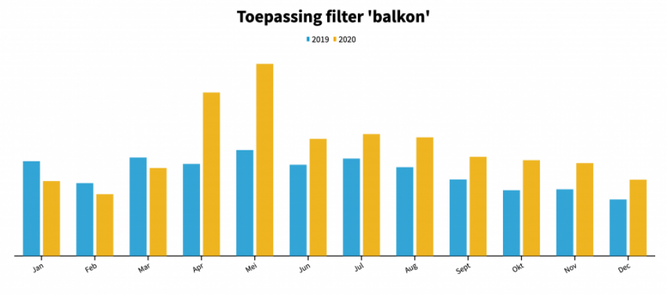 Vanaf maart nam het aantal mensen dat zocht naar een woning met buitenruimte explosief toe in vergelijking met dezelfde periode van het jaar ervoor. In april en mei 2020 werd het filter ‘balkon’ respectievelijk 77,7 en 81,3 procent vaker aangevinkt. Dat beeld veranderde de rest van het jaar eigenlijk niet. Ten opzichte van dezelfde maanden in 2019 voegden mensen een stuk vaker ‘balkon’ toe aan hun woonwensenlijst.