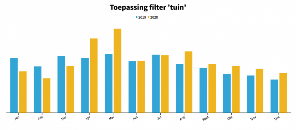 Ook naar huurwoningen met een tuin werd door woningzoekenden vaker gezocht. In april 2020 werd het filter 36,2 procent meer gebruikt dan in dezelfde maand in 2019. Ook in mei 2020, toen van versoepelingen nog geen sprake bleek, steeg het aantal zoekopdrachten voor een huurwoning met tuin met 42,6 procent.